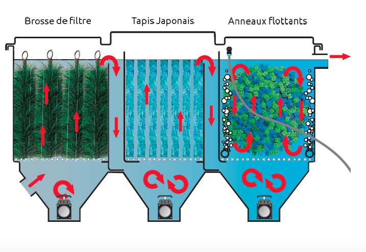 - Les 3 chambres diposent chacune d'un support de filtration différent très efficaces (brosses, tapis japonais, anneaux flottants).
