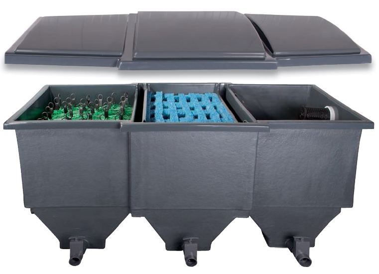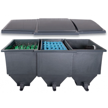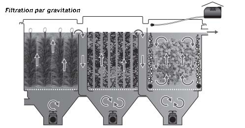- La particularité de ce filtre consiste en ses 3 chambres bien distrinctes permettant ainsi une filtration biologique optimale.