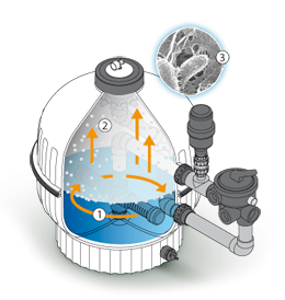 - Pendant la filtration, la saleté est retenue par les billes ce qui favorise le développement du biofilm.